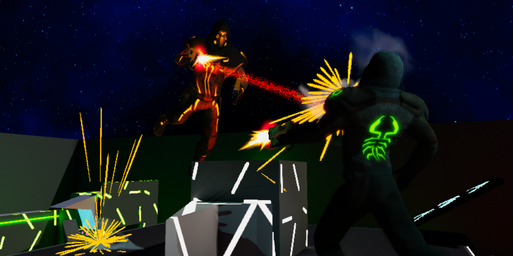 Deathmatch : Laser Arena (Massive Loop) 10/01/2025 Scifi multiplayer laser deathmatch arena 10/1/2025 : Updated all laser type visual hit effects, added master client indicator, updated jump pad vis |